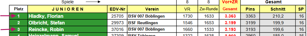 Am Sonntag konnte Flo seine Leistung bestätigen und erzielte weitere 1633 Pins. Mit einem Gesamtergebnis von 3363 Pins sicherte er sich souverän den ersten Platz und den Titel des Württembergischen Meisters der Junioren 2026.